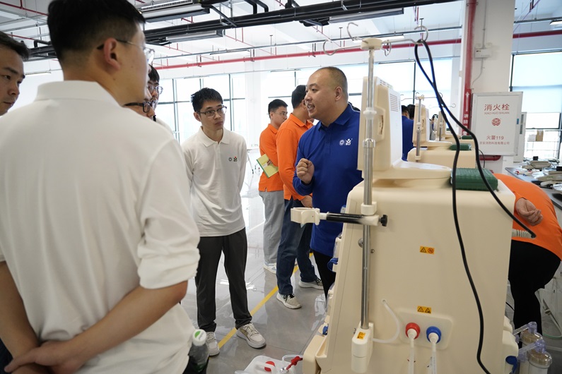 在3月13日珠海分会场的竞赛过程中,五个团队分别进行了自我介绍并抛出自己的竞赛格言,其中“乾坤未定,你我皆是黑马。”“无限进步!”等励志话语一次次点燃了赛场的热情。在理论讲授部分,医学经理陈红梅以及工程师谭鹏,分别对D系列血透滤过设备以及D800血透装置进行了介绍,随后大家就进入到真实的生产车间,去感受leyu.乐鱼全流程的生产线路,并进行机器实操讲授与考核。五位专家分别对实操进行打分并点评。