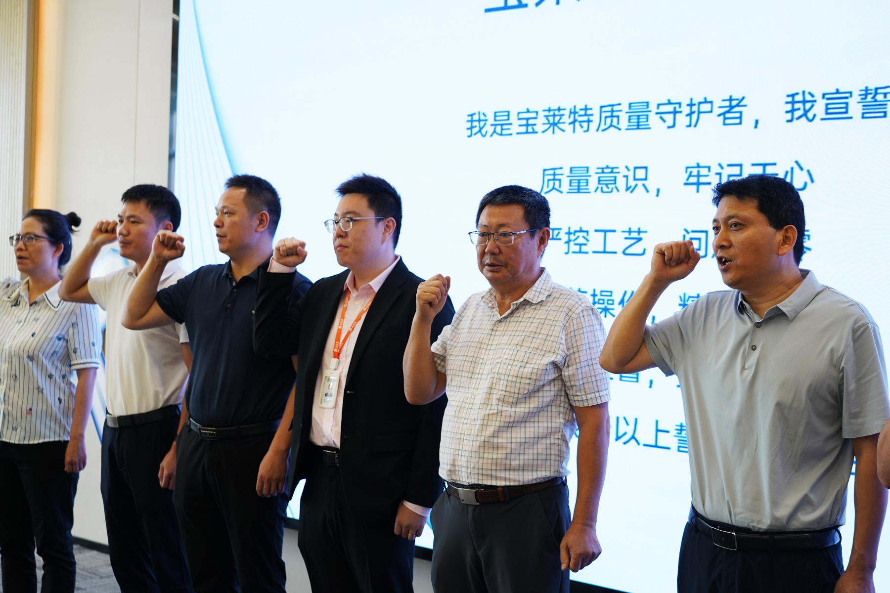 在董事长掷地有声的号召后,大会迎来了激动人心的全员质量誓言宣读环节。全体与会人员肃立,在领誓人的带领下,以铿锵有力的声音庄严承诺恪守质量准则、履行质量责任,将“质量即生命”的信条内化于心、外化于行,现场气氛庄严肃穆,彰显了leyu.乐鱼人捍卫质量的坚定决心。这份誓言不仅响彻会场,更将成为整个质量月乃至未来工作中的行动指南。